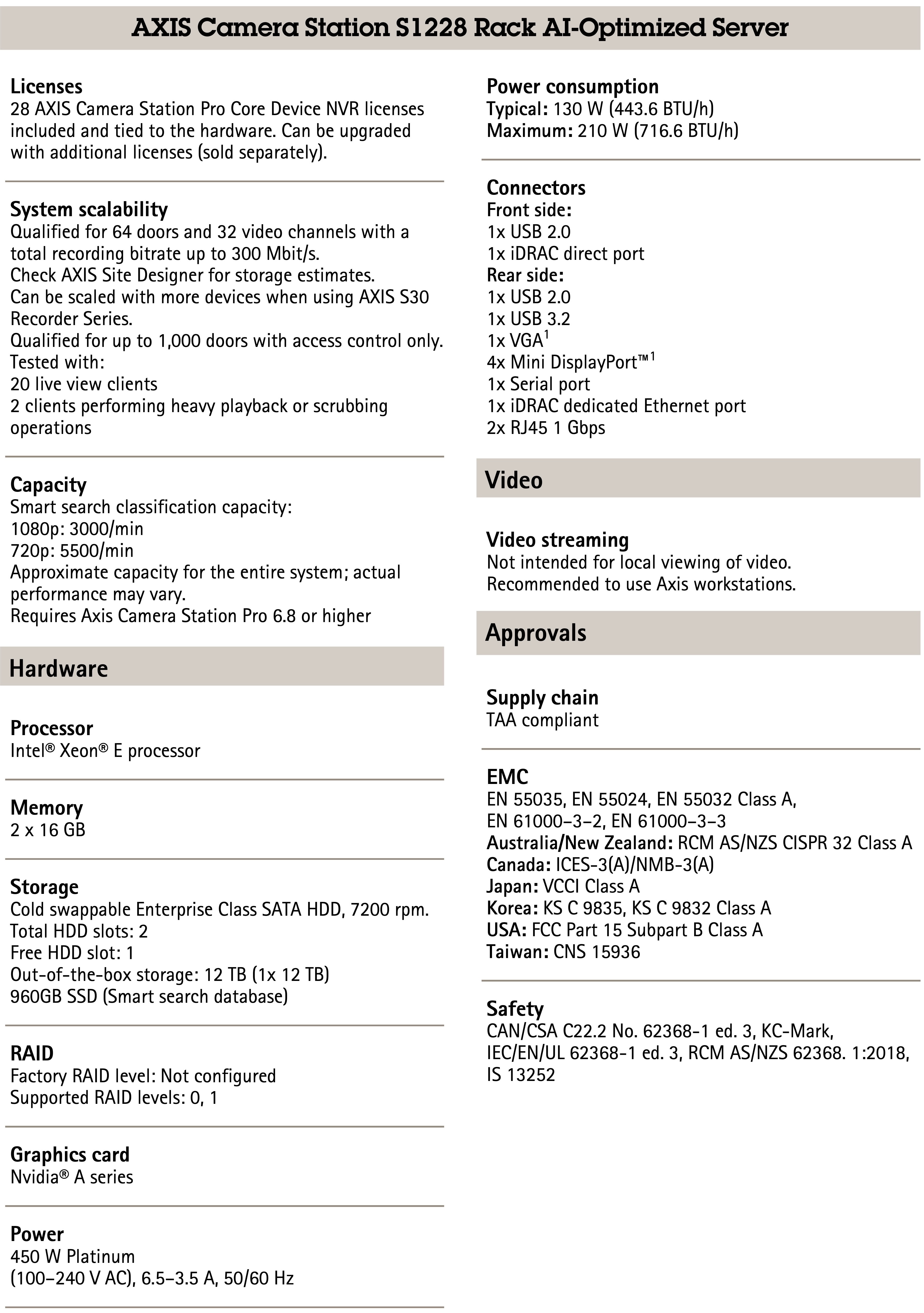 This high-performance analytics recording server offers accelerated search capabilities using free text search within Smart search. The software configuration is tailored to maximize the hardware efficiency, to quickly find objects within busy scenes. It is ideal for large or complex installations such as school, traffic or retail environment, where standard servers could take longer time to return search results. AXIS S1228 Rack AI offers an outstanding user experience when using Smart search to quickly display the free text results.